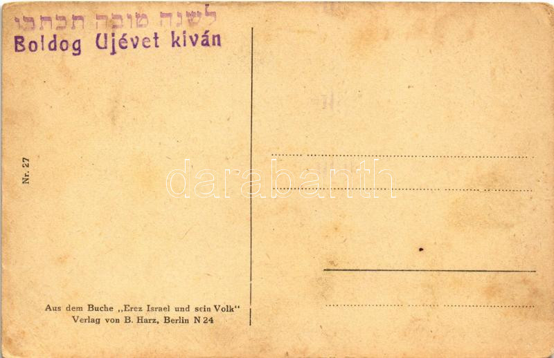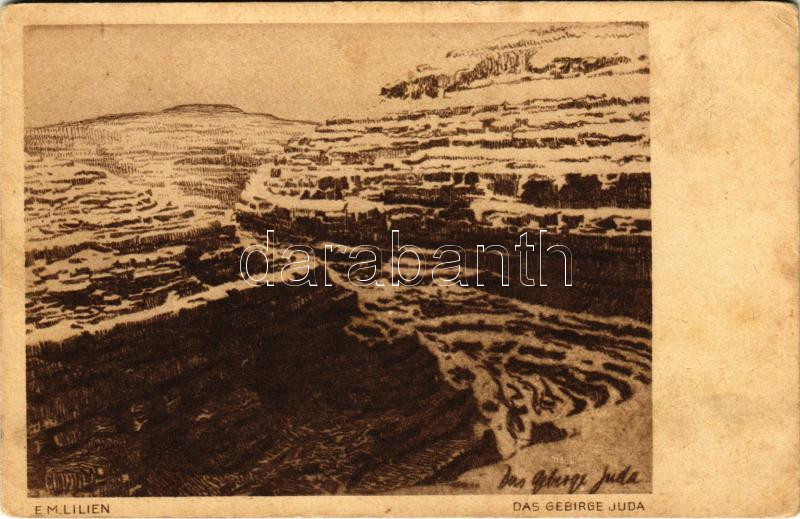 Das Gebirge Juda. Aus dem Buche "Erez Israel und sein Volk" Verlag von B. Harz Nr. 27. / Judaika művészlap, hátoldalon héber Újévi üdvözlettel / Judaica art postcard with Hebrew New Year greeting on the backside s: E. M. Lilien (EK)