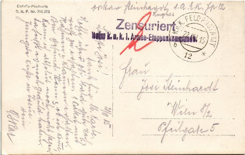 Beschreibung: 1915 Osztrák-magyar katonák télen / WWI Austro-Hungarian K.u.K. military, soldiers in winter. photo + "Zensuriert beim k.u.k. 1. Armee-Etappenkommando" (EK)