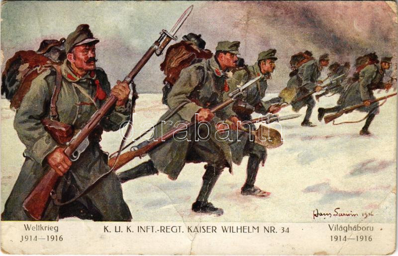 1917 Weltkrieg 1914-1916 - K.u.K. Inft.-Regt. Kaiser Wilhelm Nr. 34. Verlag K.u.K. Kmdo. der 27. Inf. Trp. Dion. / WWI Austro-Hungarian military art postcard, 34th Infantry Regiment, support fund / A tiszta jövedelem a Kárpátokban elpusztított falvak újjáépítésére és a második hadsereg legénységi özvegyei és árvái alapítványára fordították s: Hans Larwin (fa)