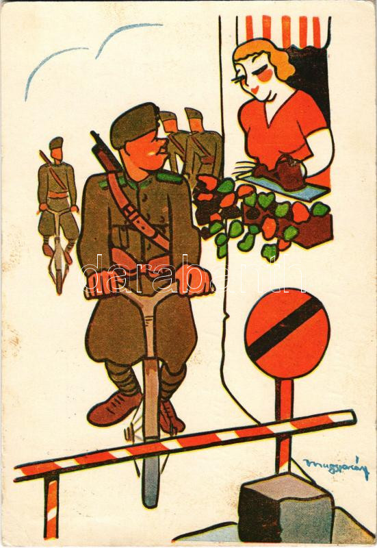 1939 Virágot locsoló hölgy és kerékpáros katona. Bruck Mihály kiadása / Hungarian military art postcard, lady and soldier with bicycle s: Magyarász (EK)