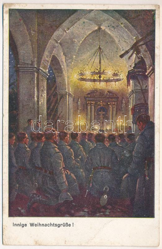Beschreibung: Innige Weihnachtsgrüße! / WWI German military art postcard, Christmas greetings, soldiers in church (ázott / wet damage)