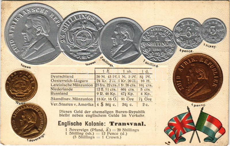 Englische Kolonie: Transvaal / set of coins, currency exchange chart, ... https://www.darabanth.com/de/444-Fernauktion/444.0/Ansichtskarten/Numismatik~2000059/Englische-Kolonie-Transvaal-set-of-coins-currency-exchange-chart-flag-Emb-litho-lyukak-pin~II2928281