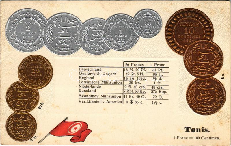 Tunis / Set of Tunisian coins, currency exchange chart, flag. M. H. Be... https://www.darabanth.com/de/444-Fernauktion/444.0/Ansichtskarten/Numismatik~2000059/Tunis-Set-of-Tunisian-coins-currency-exchange-chart-flag-M-H-Berlin-Schbg-Emb-litho-lyukak~II2928280