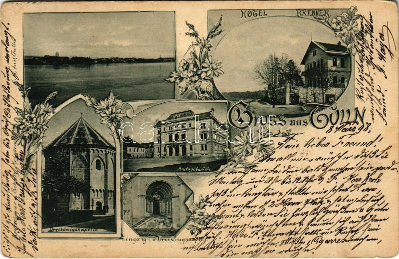 Beschreibung: 1898 (Vorläufer) Tulln, Hotel Brenner, Dreikönigskapelle und Eingang, Amtsgebäude / hotel, chapel and its entry, town hall. Art Nouveau, floral (EK)