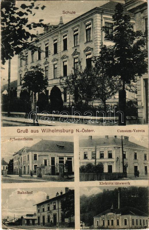 Wilhelmsburg, Schule, Arbeiterheim, Consum Verein, Bahnhof, Elektrizitätswerk / school, workers' house, shop, railway station, electric works (tear)