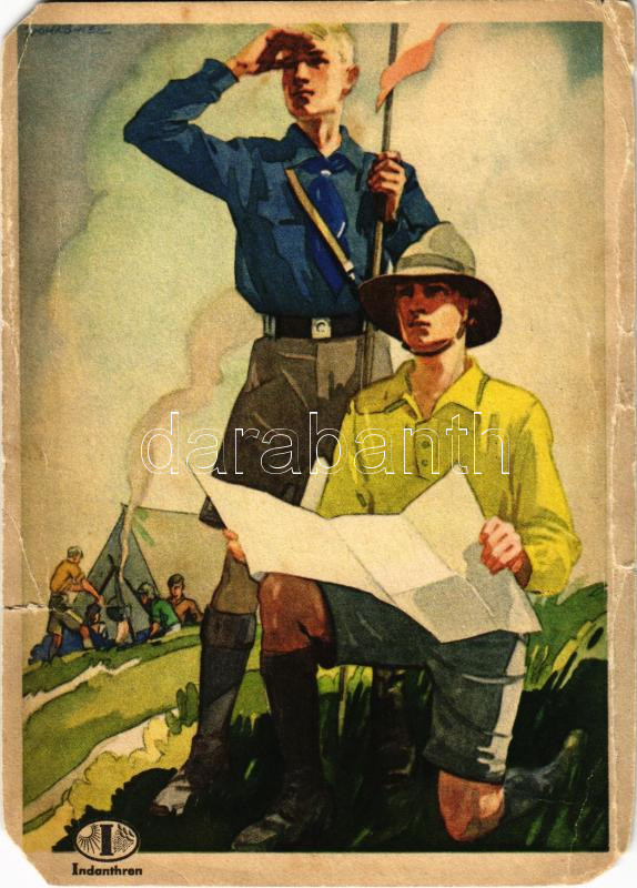 1933 Indanthren textilfesték reklámlap cserkészekkel, mosás és időjárásálló viselet / Indanthren textile paint advertisement card, boy scouts. artist signed (b)