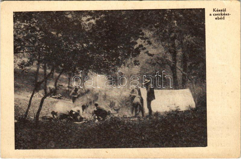 Beschreibung: Készül a cserkész ebéd. Budapesti Kegyesrendi Főgimnázium cserkészcsapatai. Piarista Cserkészcsapat kiadása / Hungarian scout camp, making lunch