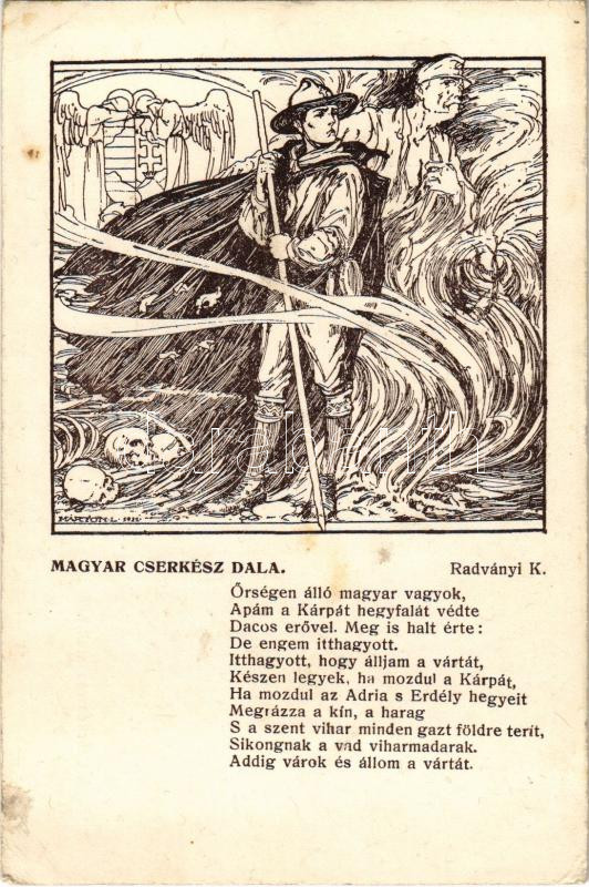 Magyar cserkész dala. R. M. (Regnum Marianum) Cserkészcsapatai 7. / Hungarian boy scout art postcard, Hungarian coat of arms, irredenta s: Márton L. (EK)