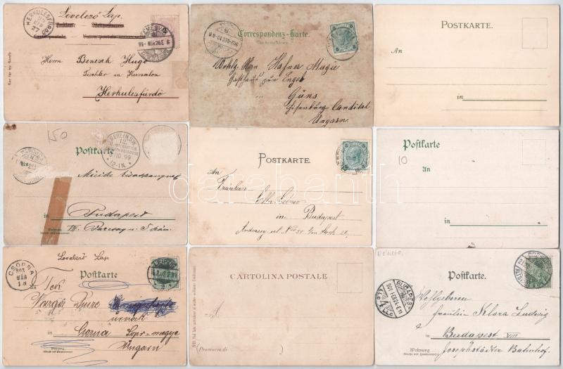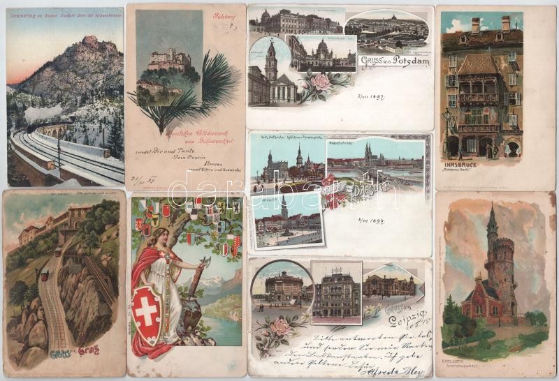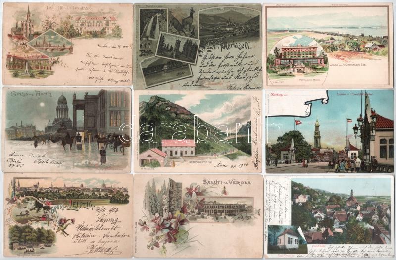 76 db RÉGI külföldi város képeslap és pár motívum kis albumban, vegyes minőség, sok német és osztrák lithoval és hosszú címzéses lappal / 76 pre-1945 European town-view postcards and some motives in a small album, mixed quality, many German and Austrian lithos and lot of pre-1900 postcards