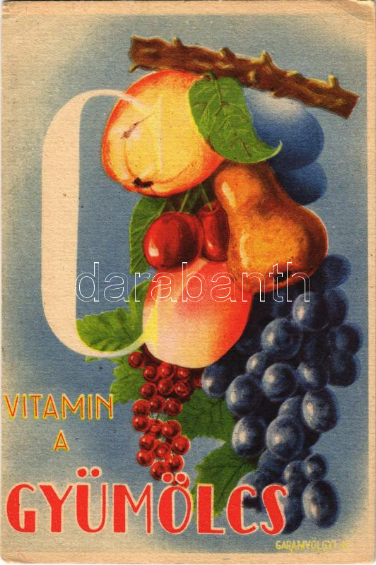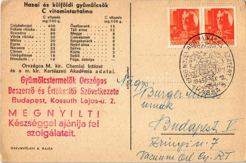 Vitamin a gyümölcs! Magyar egészségügyi propaganda, C-vitamin táblázat a hátoldalon / Hungarian health campaign propaganda, Vitamin C chart s: Garamvölgyi K. + "1938. november 11. Kassa visszatért 1943. X. 12." So. Stpl. (EB)