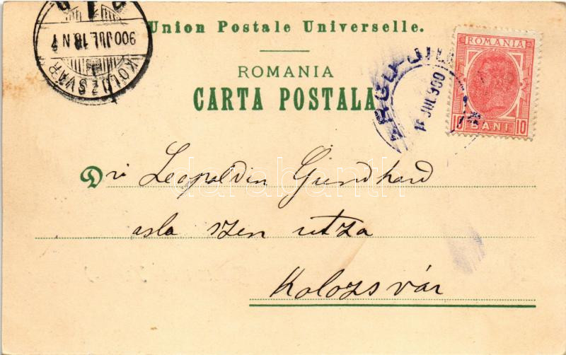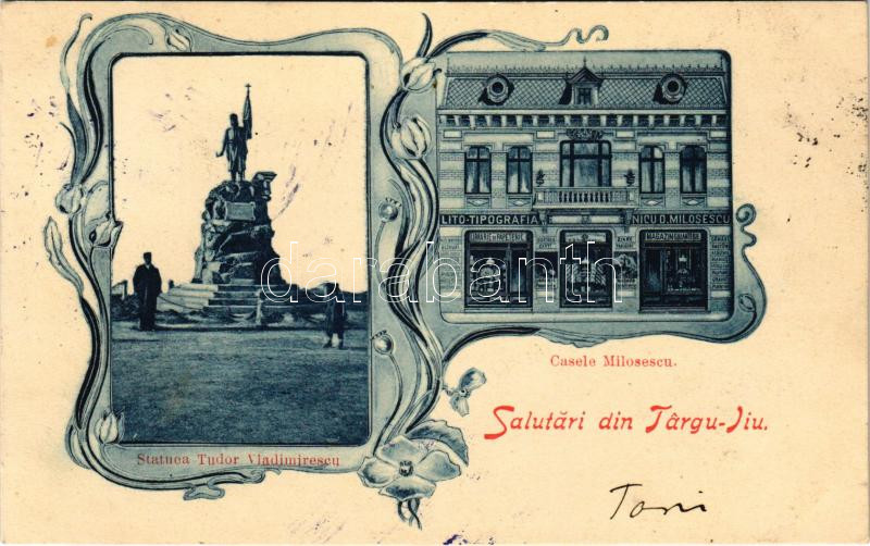 Beschreibung: 1900 Targu Jiu, Zsilvásárhely; Statua Tudor Vladimirescu, Casele Milosescu / statue, shop and house of Milosescu. Art Nouveau, floral (fl)