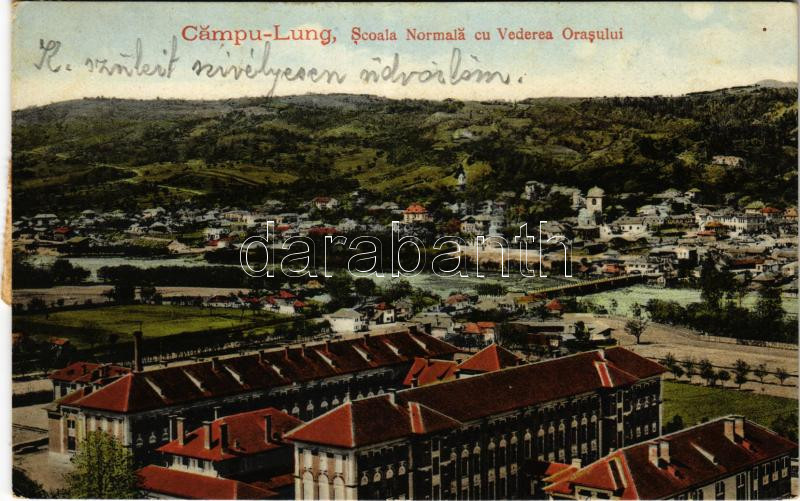 Beschreibung: 1923 Campulung Muscel, Hosszúmező, Kimpolung, Cimpolung (Arges); Scoala Normala cu Vederea Orasului / school, general view (EK)
