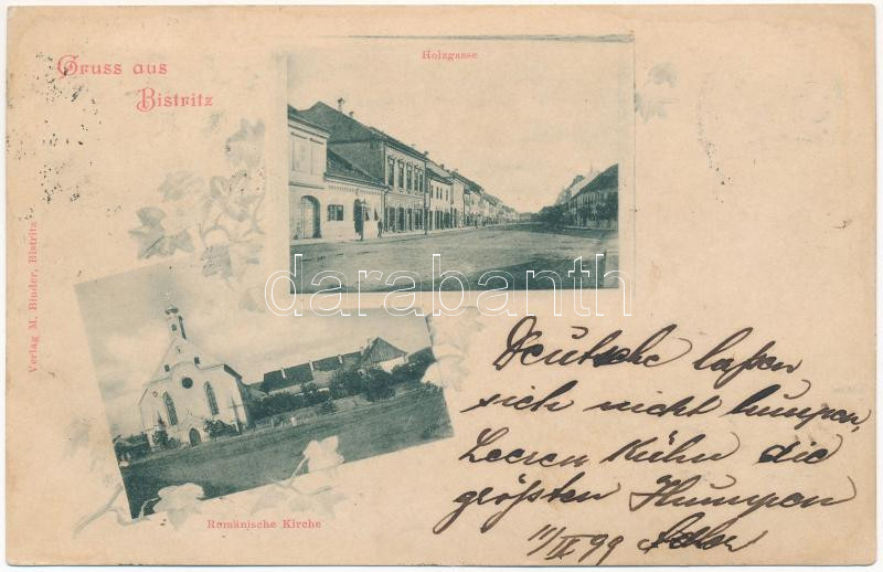 1899 (Vorläufer) Beszterce, Bistritz, Bistrita; Holzgasse, Rumänische Kirche / utca, román templom / street, Romanian church. M. Binder Art Nouveau, floral
