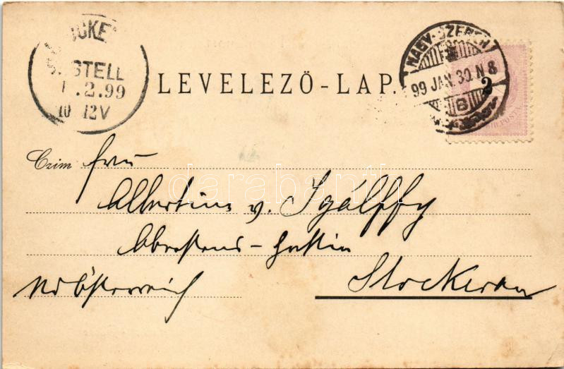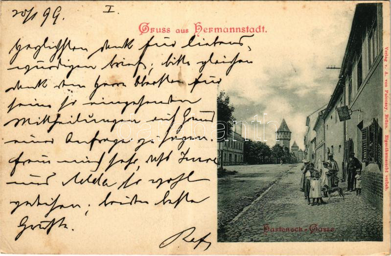1899 (Vorläufer) Nagyszeben, Hermannstadt, Sibiu; Harteneck-Gasse / Harteneck utca és tornyok, üzlet. A. von Palocsay kiadása / street view, towers, shop (EK)