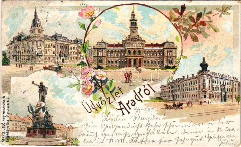 Beschreibung: 1900 Arad, 13 Vértanú szobra, Városház tér, Városháza, lóvasút. Kerpel Izsó kiadása / Martyrs' monument, town hall, horse-rawn tram. Art Nouveau, floral, litho (EM)