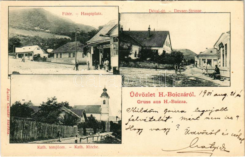 1901 Boica, Kisbánya, Hunyad-Boica, Baita, Boita; Fő tér, Dévai út, Katolikus templom. Balázs Gusztáv üzlete és saját kiadása / main square, street, church, shop (apró szakadás / tiny tear)