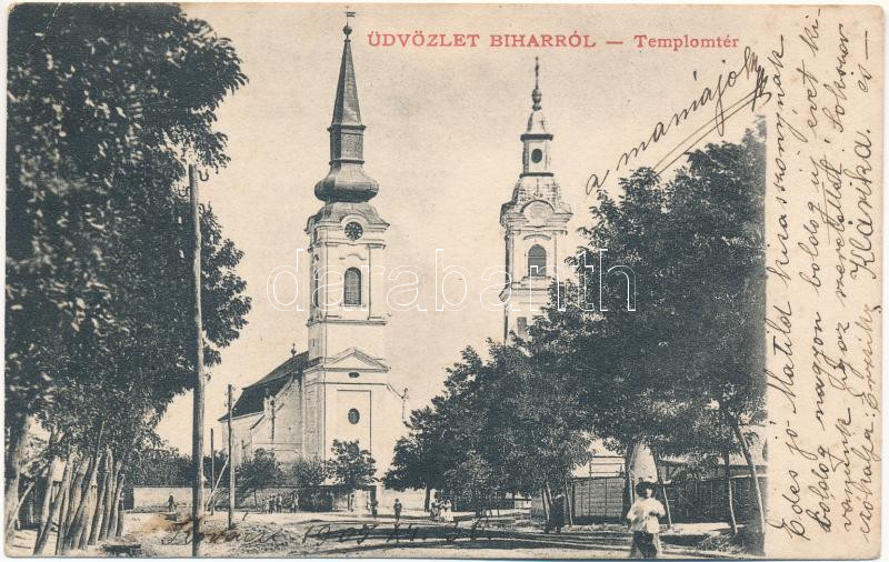 Beschreibung: 1906 Bihar, Biharia; Templom tér. Helyfi László kiadása / churches (EK)