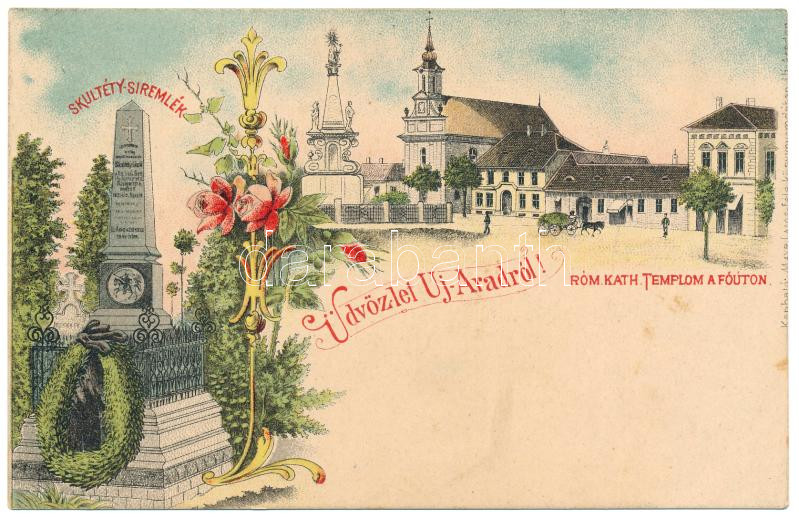 Arad, Újarad, Aradul Nou; Skultéty síremlék, Római katolikus templom a főúton. Mayr Lajos kiadása / tombstone, Catholic church, street view. Art Nouveau, floral, litho (fl)