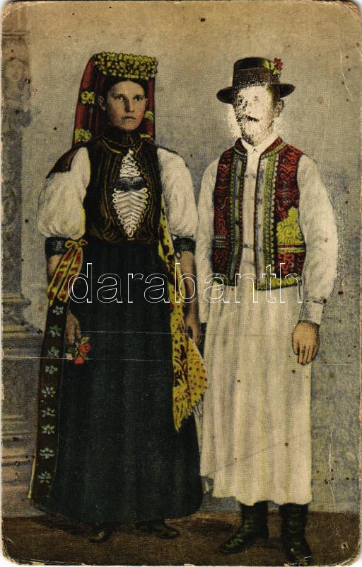 Beschreibung: Bánffyhunyad, Huedin; Bánffyhunyadi menyasszony és vőlegény / Transylvanian folklore from Huedin (felületi kopás / worn surface)