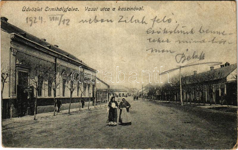 Érmihályfalva, Valea lui Mihai; Vasút utca a kaszinóval / street view,... https://www.darabanth.com/de/444-Fernauktion/444.0/Ansichtskarten/Siebenburgen~2000006/Ermihalyfalva-Valea-lui-Mihai-Vasut-utca-a-kaszinoval-street-view-casino-kopott-sarkak-w~II2927438