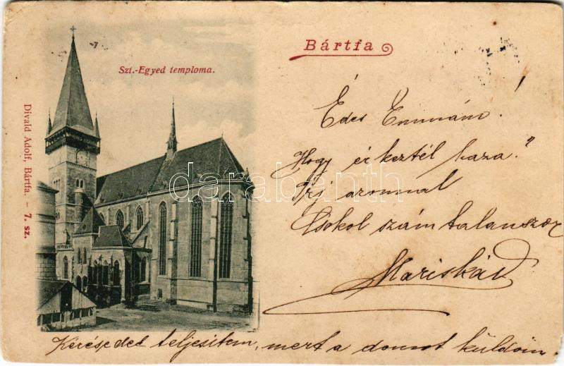 Beschreibung: 1899 (Vorläufer) Bártfa, Bártfafürdő, Bardejovské Kúpele, Bardiov, Bardejov; Szent Egyed temploma. Divald Adolf 7. sz. / church (EM)