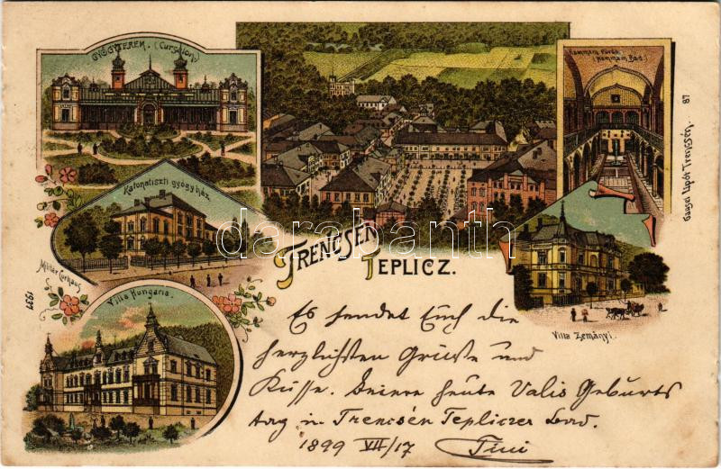 1899 (Vorläufer) Trencsénteplic, Trencianske Teplice; gyógyterem, katonatiszti gyógyház, Villa Hungaria és Zemányi, Hammam fürdő, belső. Gansel Lipót 87./ spa, military spa, villas, Turkish bath interior. Art Nouveau, floral, litho (Rb)