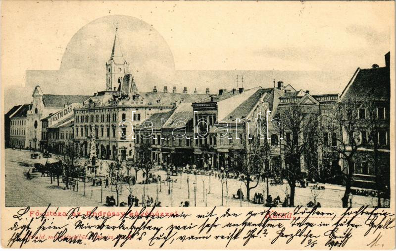 Beschreibung: 1901 Kassa, Kosice; Fő utca, Andrássy kávéház, piac, keztyű gyár. Divald / main street, cafe shop, market (EB)