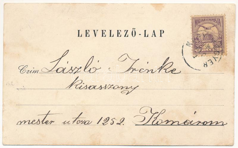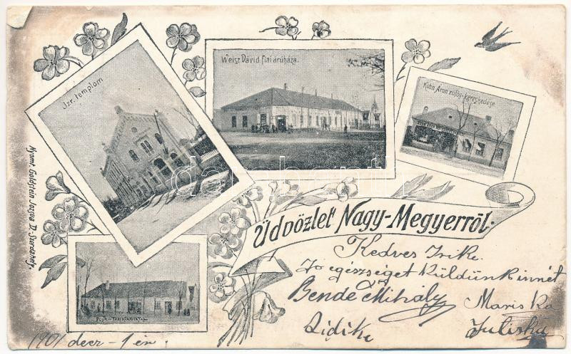 1901 Nagymegyer, Velky Meder, Calovo; izraelita templom, zsinagóga, posta és távirda hivatal, Weisz Dávid fiai áruháza, Kohn Áron rőfös kereskedő üzlete. Goldstein Jozsua kiadása / synagogue, shops, posta and telegraph office. Art Nouveau, floral (EK)