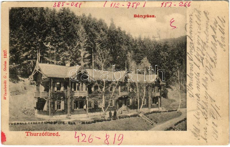 1902 Thurzófüred, Kúpele Turzov (Gölnicbánya, Gelnica); Bányász villa.... https://www.darabanth.com/de/444-Fernauktion/444.0/Ansichtskarten/Slowakei~2000007/1902-Thurzofured-Kupele-Turzov-Golnicbanya-Gelnica-Banyasz-villa-Wlaszlovits-G-kiadas~II2933140
