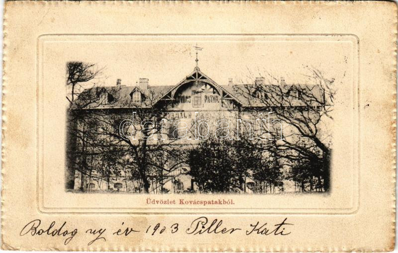 Beschreibung: 1903 Kovácspatak, Kovacov; Nyaraló szálloda. Stromf Ignác kiadása / villa hotel (fl)