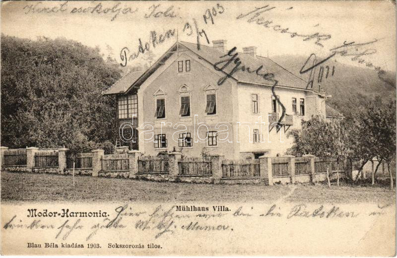 1903 Modor-Harmónia, Modern-Harmonie, Modra; Mühlhaus Villa. Blau Béla... https://www.darabanth.com/de/444-Fernauktion/444.0/Ansichtskarten/Slowakei~2000007/1903-Modor-Harmonia-Modern-Harmonie-Modra-Muhlhaus-Villa-Blau-Bela-kiadasa-villa-EB~II2932176