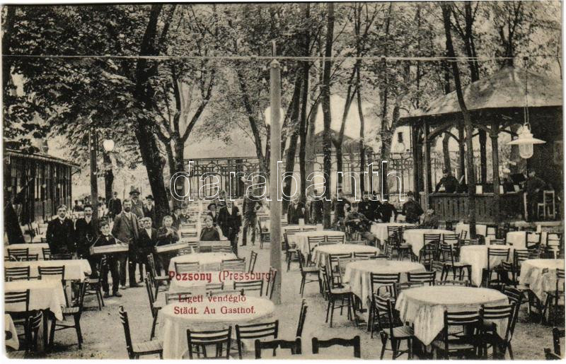 1907 Pozsony, Pressburg, Bratislava; Ligeti vendéglő, terasz, pavilonok, pincérek, katonák / Städt. Au Gasthof / restaurant with waitres, soldiers, teras, pavilions (EK)