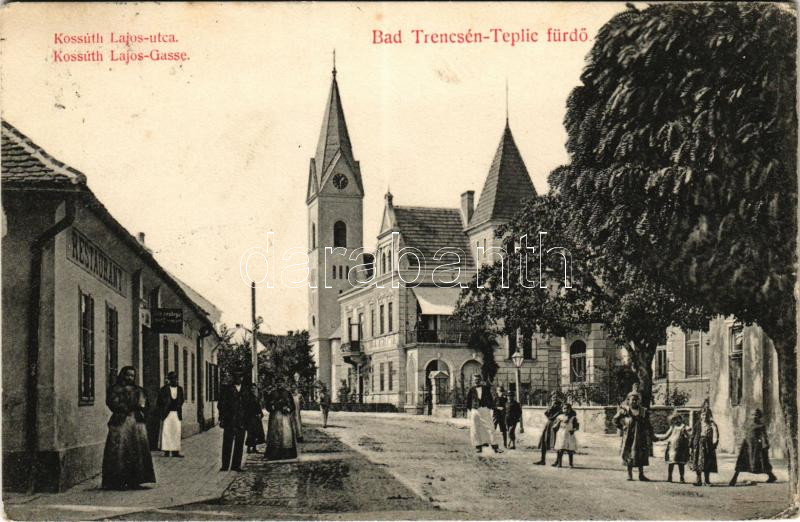 1909 Trencsénteplic, Trencianske Teplice; Kossuth Lajos utca, étterem ... https://www.darabanth.com/de/444-Fernauktion/444.0/Ansichtskarten/Slowakei~2000007/1909-Trencsenteplic-Trencianske-Teplice-Kossuth-Lajos-utca-etterem-street-view-restaurant-k~II2929414