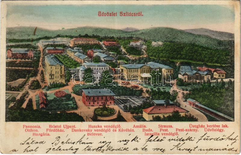 1910 Szliács, Sliac; Pannonia, Otthon, Hungaria, Fürdőház, Buda, Bellevue, Bristol, Újpest, Huszka vendéglő, Amália, Strauss, Dankovsky kávéház és étterem, Pest és Pestszárny szálloda, Izraelita zsidó vendéglő, Üdvözlégy, Üvegház kertész lak. Molnár M. kiadása / hotels, Jewish restaurant, greenhouse, café, villa (fl)