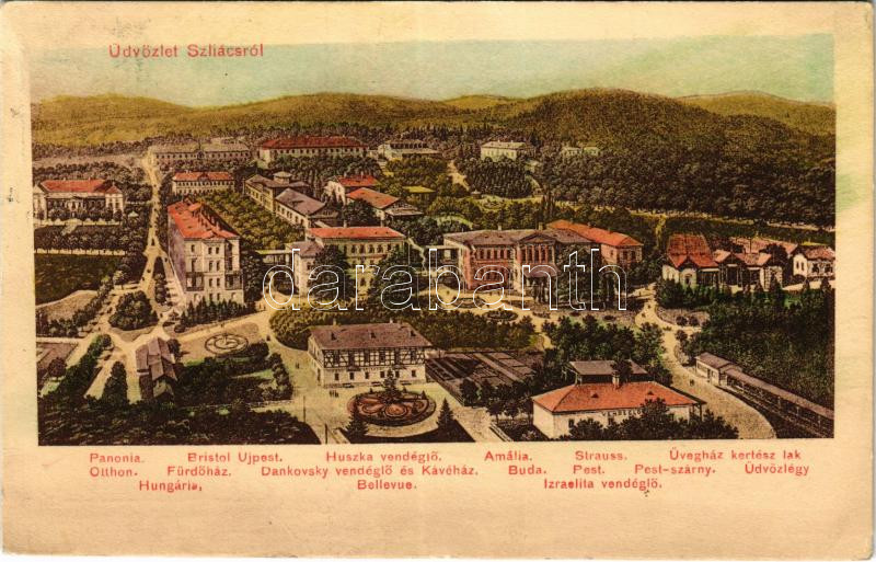 1910 Szliács, Sliac; Pannonia, Otthon, Hungaria, Fürdőház, Buda, Bellevue, Bristol, Újpest, Huszka vendéglő, Amália, Strauss, Dankovsky kávéház és étterem, Pest és Pestszárny szálloda, Izraelita zsidó vendéglő, Üdvözlégy, Üvegház kertész lak / hotels, Jewish restaurant, greenhouse, café, villa (EB)