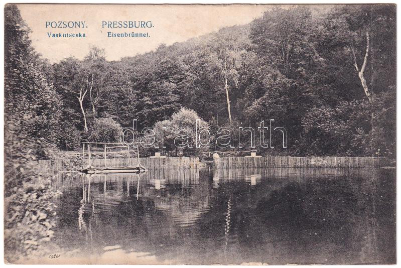 Beschreibung: 1911 Pozsony, Pressburg, Bratislava; Vaskutacska. Kaufmann kiadása / Eisenbrünnel (Eisenbründl) / Zelezná Studienka / spa, lake (ázott / wet damage)