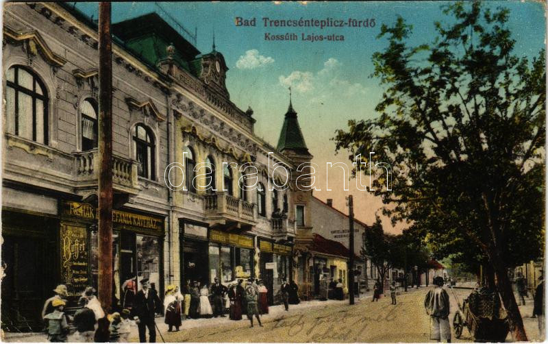 1916 Trencsénteplic, Trencianske Teplice; Kossuth Lajos utca, Rehák Emil Stefánia kávéháza. Vasúti levelezőlapárusítás 15. / street view, café, shops (EK)
