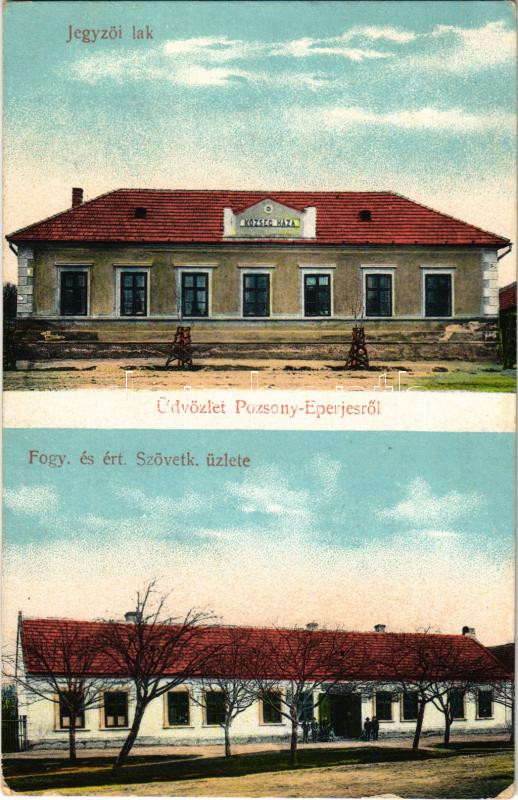 Beschreibung: 1926 Pozsonyeperjes, Jahodná; Jegyzői lak, Fogyasztási és értékesítő szövetkezet üzlete és saját kiadása / notary office, cooperative shop