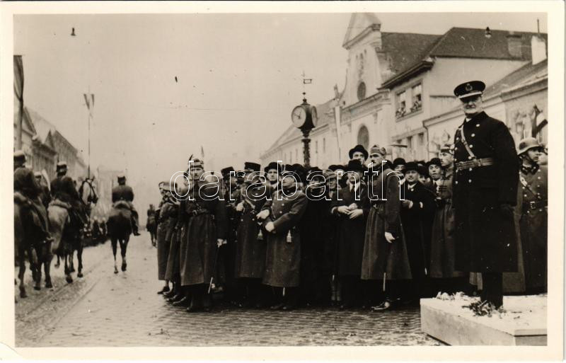 1938 Kassa, Kosice; bevonulás. Honvédeink díszmenete Magyarország Kormányzója előtt. Vitéz A. kiadása. Foto Ginzery S. / entry of the Hungarian troops, military parade, Regent Horthy (EK)