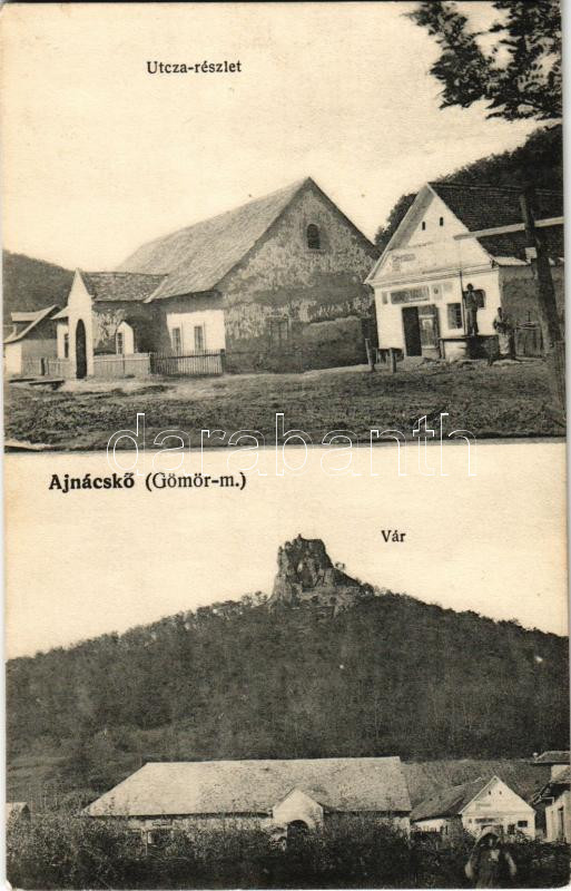 Beschreibung: Ajnácskő, Hajnácka (Gömör); utca, vár, Pozsonyi Károly üzlete és saját kiadása / street, castle, shop