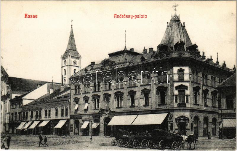 Kassa, Kosice; Andrássy palota, lovas hintók, Dr. Holzman, Gilányi, Migály Sándor, Gaál Gyula és fia üzlete. László Béla kiadása / palace, shops, horse chariots (EK)