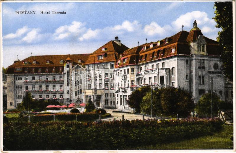 Pöstyén, Piestany; Hotel Thermia szálloda / hotel, spa (EK) https://www.darabanth.com/de/444-Fernauktion/444.0/Ansichtskarten/Slowakei~2000007/Postyen-Piestany-Hotel-Thermia-szalloda-hotel-spa-EK~II2926392