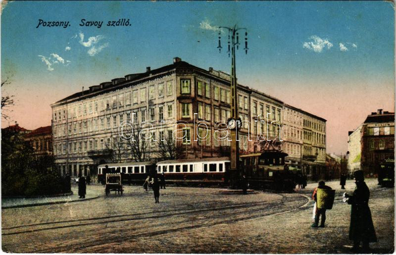 Pozsony, Pressburg, Bratislava; Savoy szálloda, kisvasút, városi vasút... https://www.darabanth.com/de/444-Fernauktion/444.0/Ansichtskarten/Slowakei~2000007/Pozsony-Pressburg-Bratislava-Savoy-szalloda-kisvasut-varosi-vasut-vonat-hotel-urban-rai~II2932942