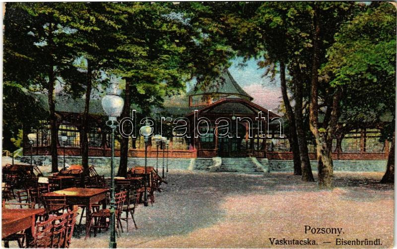 Pozsony, Pressburg, Bratislava; Vaskutacska vendéglő, terasz, pavilon ... https://www.darabanth.com/de/444-Fernauktion/444.0/Ansichtskarten/Slowakei~2000007/Pozsony-Pressburg-Bratislava-Vaskutacska-vendeglo-terasz-pavilon-Eisenbrundl-restaurant-~II2932195