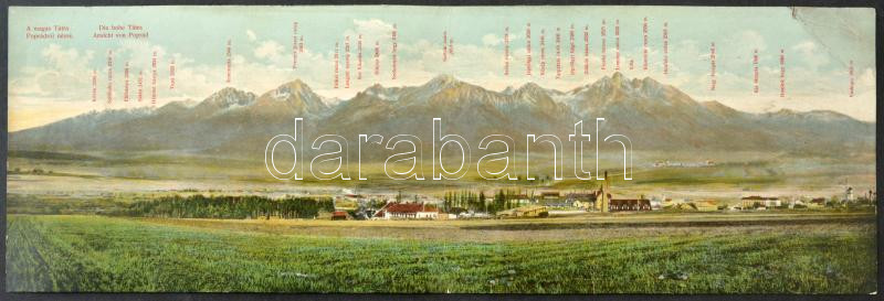 Beschreibung: Tátra, Magas-Tátra, Vysoké Tatry; Poprádról nézve. Divald Károly kiadása, 3-részes hajtatlan óriás panorámalap / general view. 3-tiled unfolded giant panoramacard (43 x 14,2 cm) (szakadás / tear)