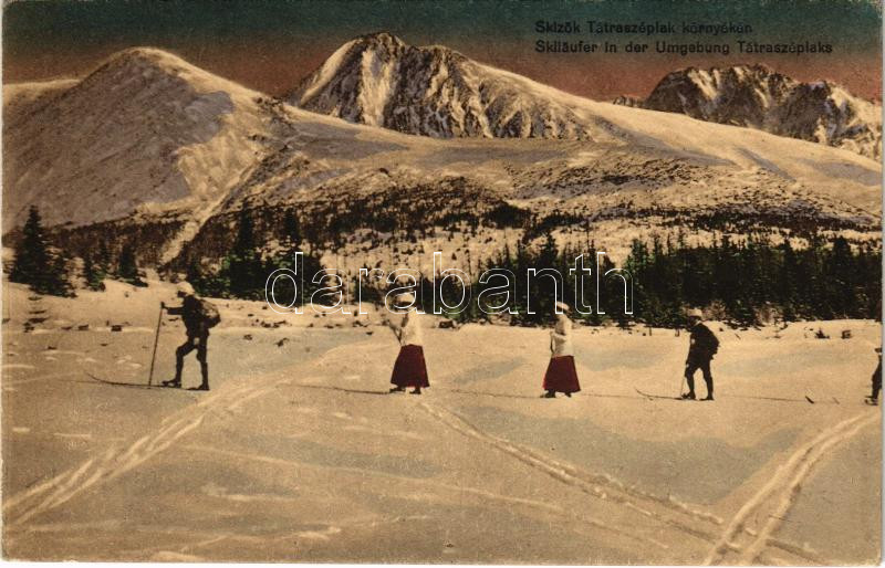 Tátraszéplak, Tatranska Polianka, Westerheim (Magas-Tátra, Vysoké Tatry); téli élet, síelők csoportja. Cattarino S. utóda Földes Samu kiadása 1912. 30.. Dr. Guhr felvétele / Skiläufer in der Umgebung Tátraszéplaks / winter sport, skiing group