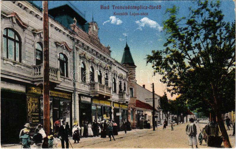 Beschreibung: Trencsénteplic, Trencianske Teplice; Kossuth Lajos utca, Rehák Emil Stefánia kávéháza. Vasúti levelezőlapárusítás 15. / street view, café, shops (EK)