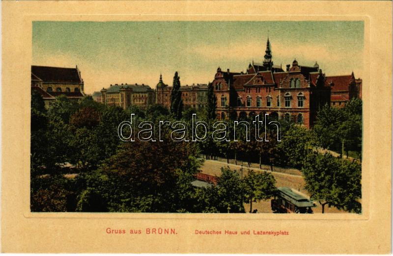 Beschreibung: Brno, Brünn; Deutsches Haus und Lazanskyplatz / German house, tram, street view. Verlag Ascher & Redlich