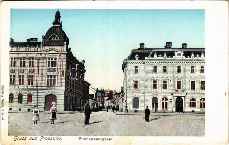 Beschreibung: Prostejov, Prossnitz; Plumenauergasse / street view. Verlag J. Fuchs (fl)