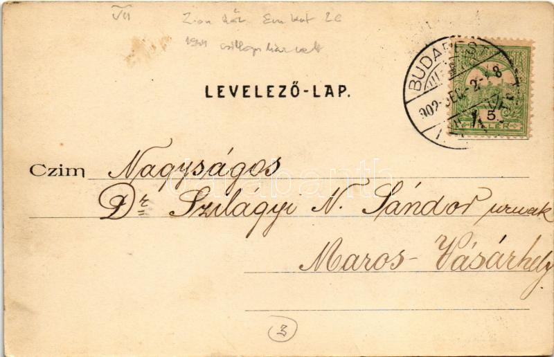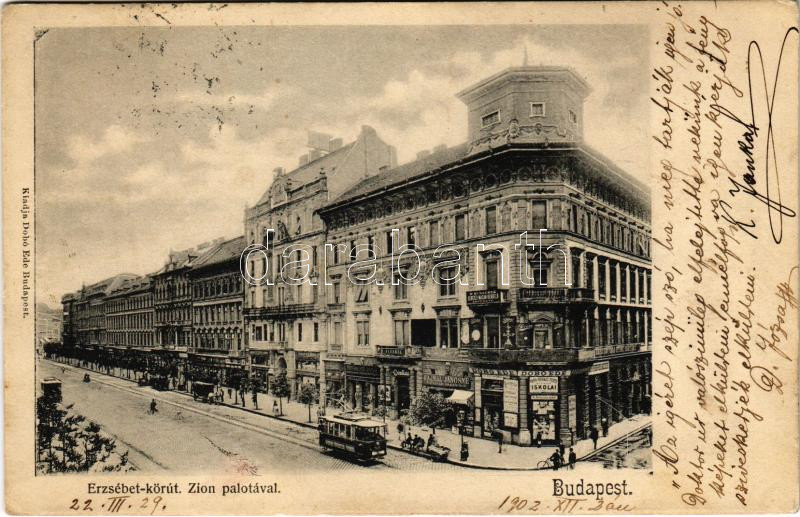 1902 Budapest VII. Erzsébet körút a Zion palotával (1944-ben sárga csillagos ház volt), villamos, Hajnal Jánosné, Dobó Ede üzlete és saját kiadása (EK)